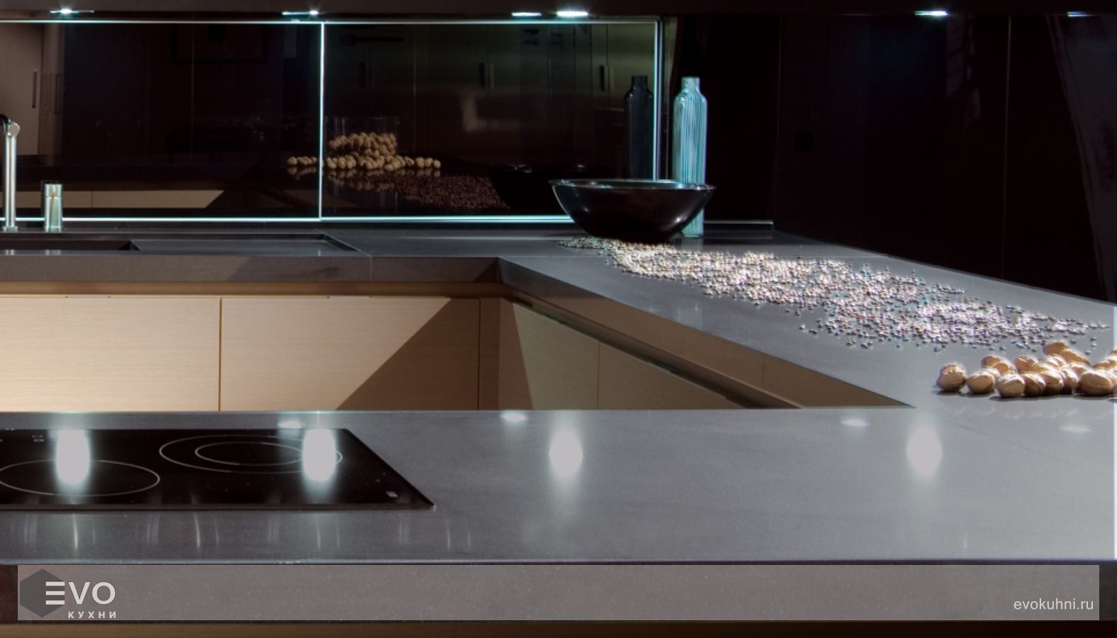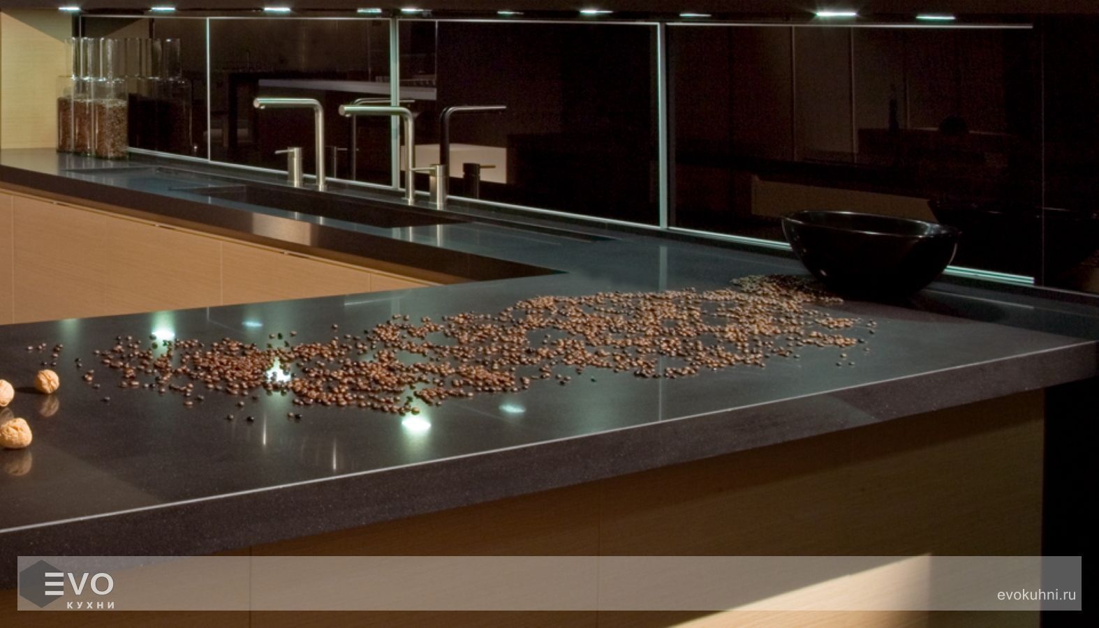 - Столешница для кухни из кварца будет очень удобна в использовании, потому что ее невозможно поцарапать ножом.