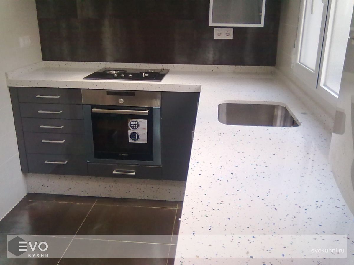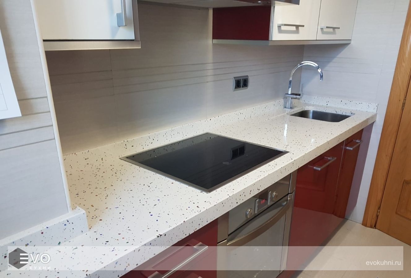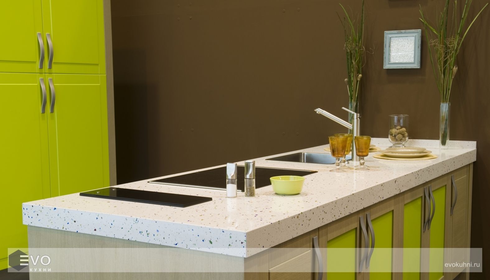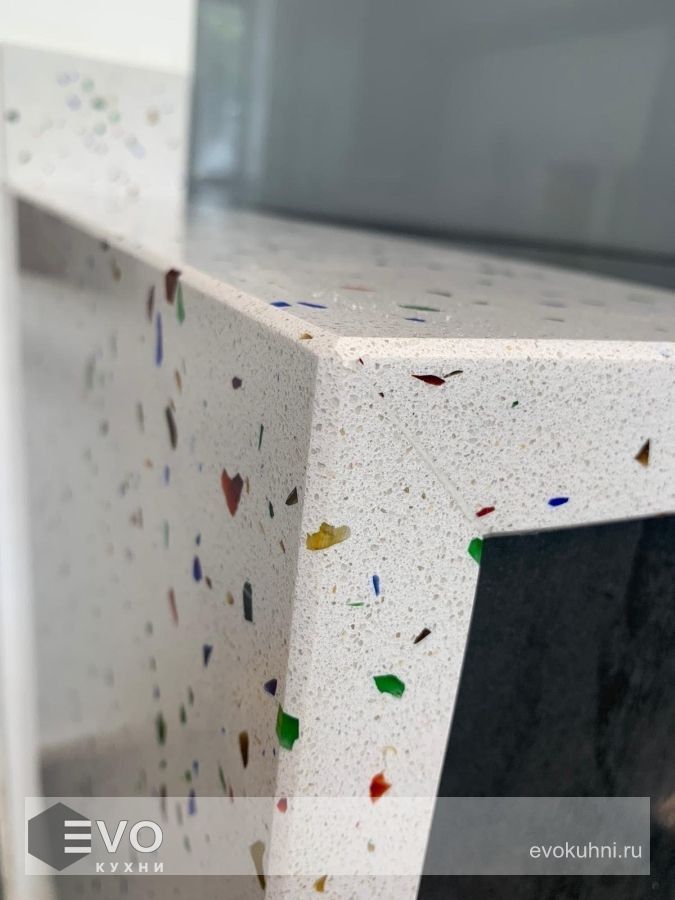 - Столешница для кухни из кварца будет очень удобна в использовании, потому что ее невозможно поцарапать ножом.