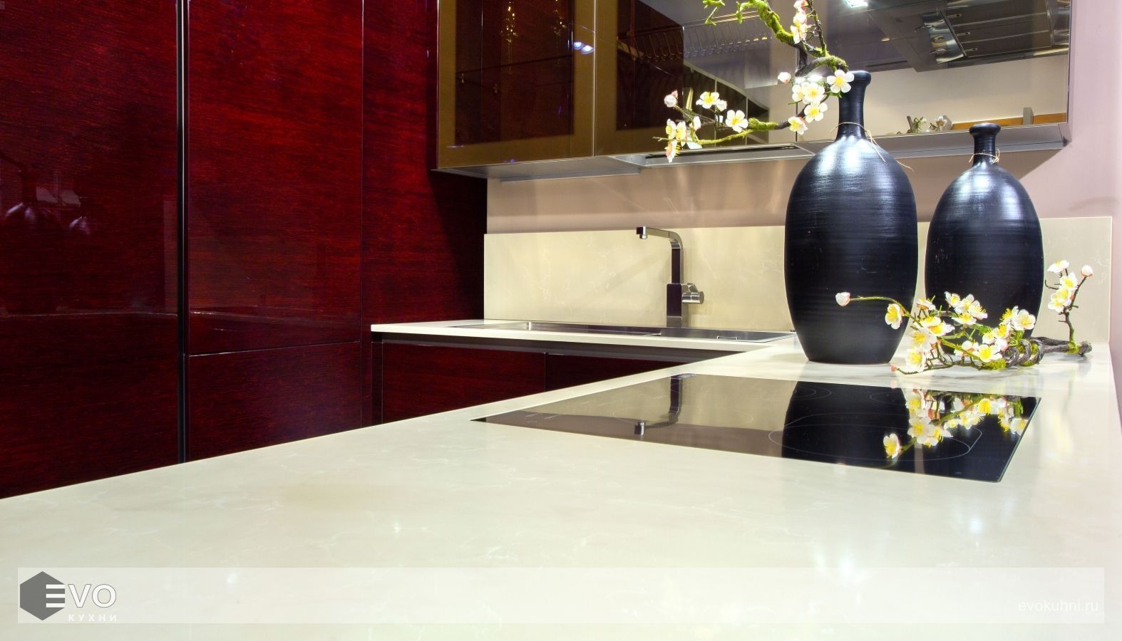 - Устойчивость к бытовым кислотам. Как уже было отмечено, кварцевый камень не имеет в своей структуре пор и трещин, что позволяет избегать негативного влияния на поверхность любых пищевых и химических продуктов. Благодаря этому никаких пятен и других загрязнений никогда не появится.