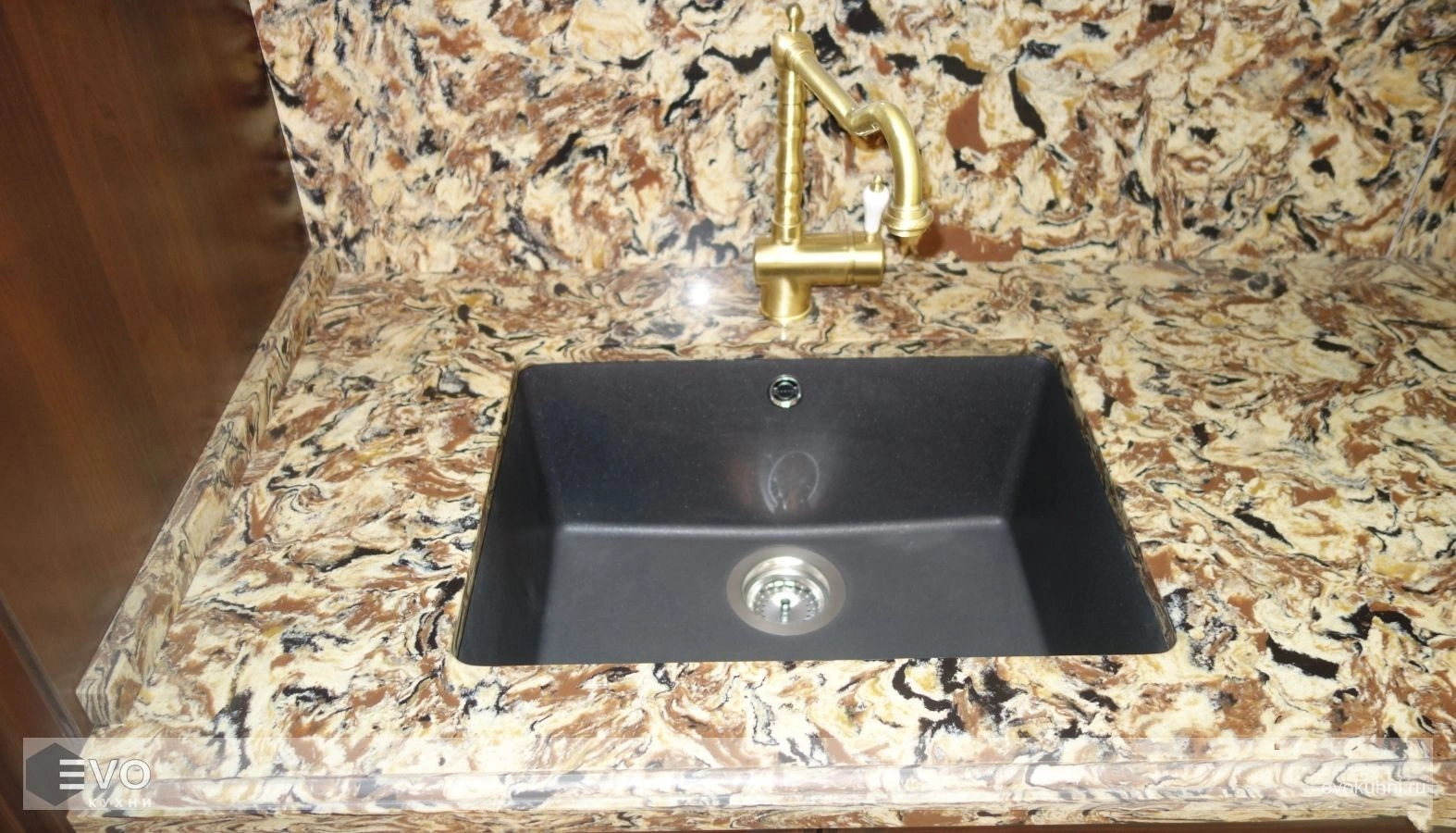 - Устойчивость к бытовым кислотам. Как уже было отмечено, кварцевый камень не имеет в своей структуре пор и трещин, что позволяет избегать негативного влияния на поверхность любых пищевых и химических продуктов. Благодаря этому никаких пятен и других загрязнений никогда не появится.