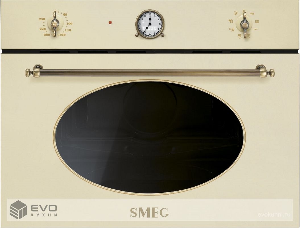 Микроволновая печь Smeg SF4800MPO – прибор выполнен в классическом дизайне, декор стилизован под состаренную временем латунь – это функциональная, надежная и красивая бытовая техника для кухни. Режимы разморозки по весу и времени обеспечат комфортное использование. Звуковой сигнал отключения оповестит об окончании программы приготовления.