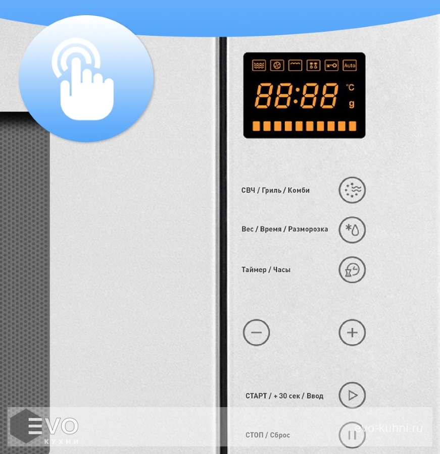 Для обработки продуктов и готовых блюд используются следующие виды нагрева: Микроволны, Гриль, Микроволны + гриль. Выберите гриль, чтобы получить поджаристую корочку на мясе или рыбе. Если вы спешите, а еду нужно разогреть, используйте быстрый старт — благодаря ему 30 секунд прибор работает на полной мощности. Отдельная опция для размораживания продуктов и полуфабрикатов облегчает жизнь — не нужно самостоятельно настраивать параметры.