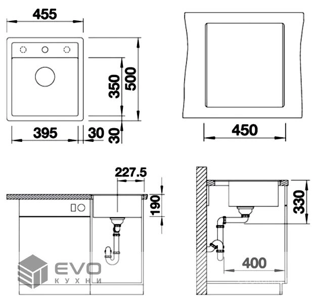 | от 450 мм | Учитывать ширину пристенного канта в случае установки мойки возле стены. |