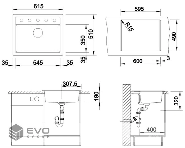 | от 600 мм | Учитывать ширину пристенного канта в случае установки мойки возле стены. |