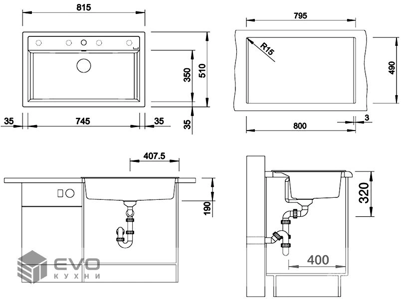 | Сверху на столешницу | Мойка устанавливается сверху в предварительно подготовленный вырез в столешнице. |