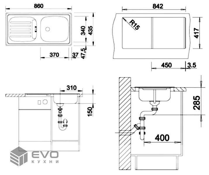 | Сверху на столешницу | Мойка устанавливается сверху в предварительно подготовленный вырез в столешнице. |