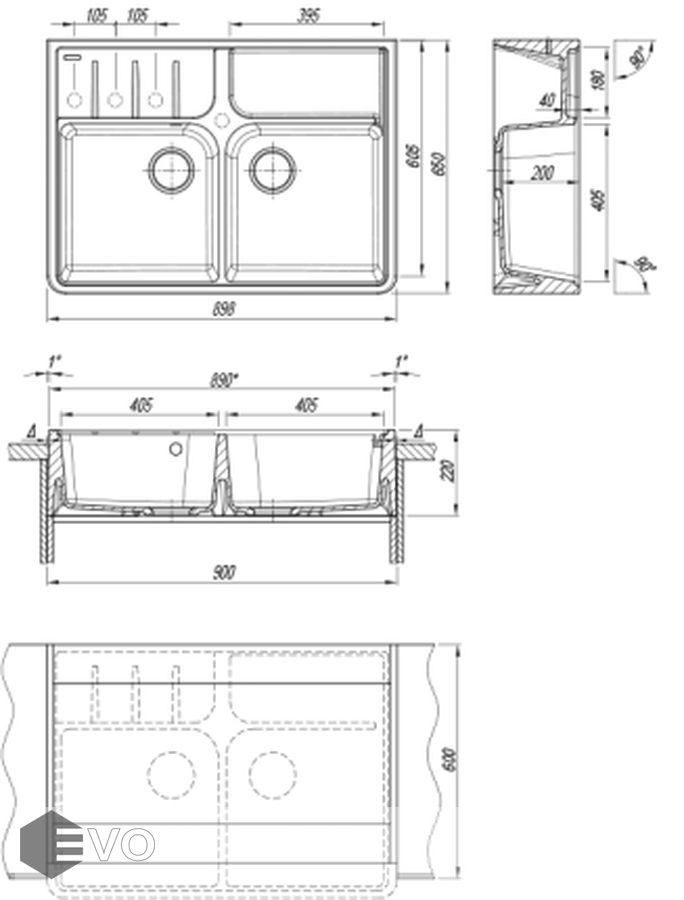 - Комплектация мойки: Сливная арматура с двумя корзинчатыми вентилями 3 1/2", сифон и комплект крепежа