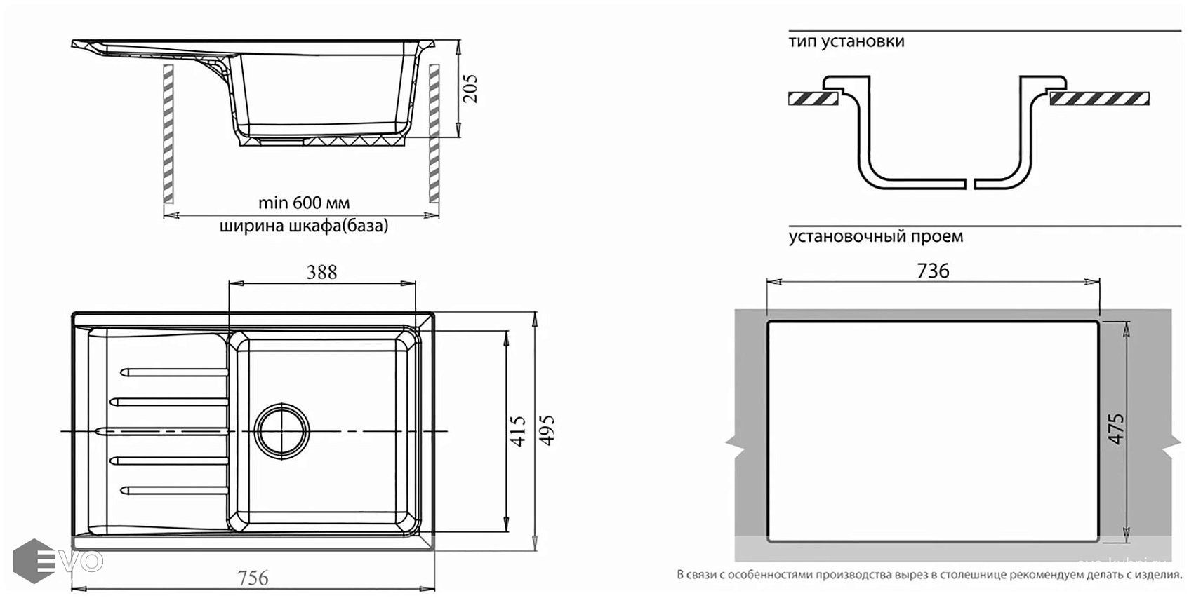 - Размер монтажного отверстия под мойку (ШхГ): 74x48 см