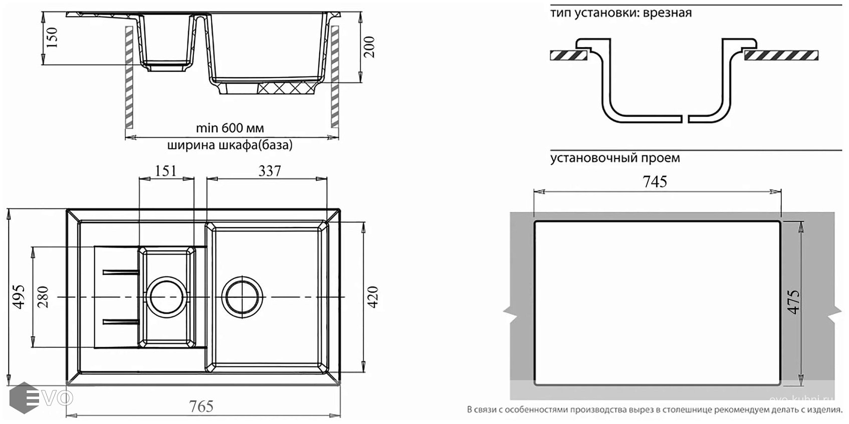 - Размеры чаш: 337х420х200 мм, 151*280*150 мм