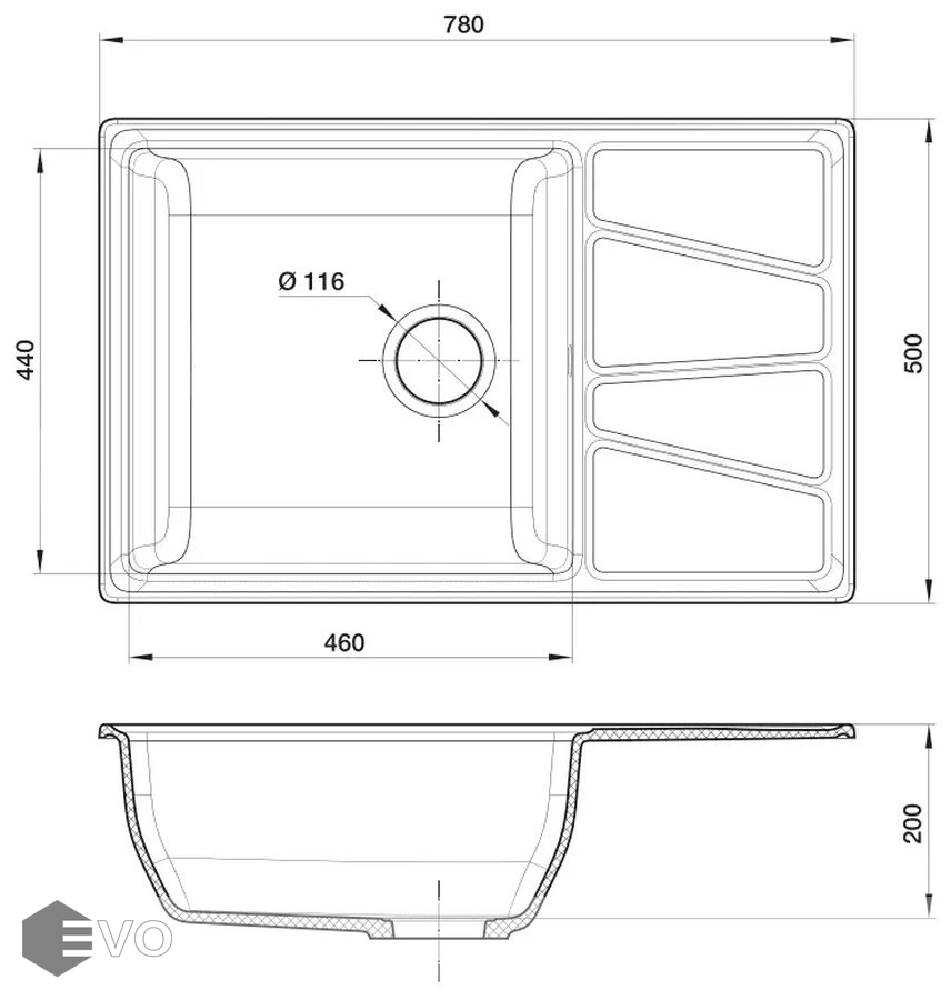 Мойка кухонная Granfest Vertex V-780L оснащена специальным отверстием, которое обеспечивает защиту от перелива воды.