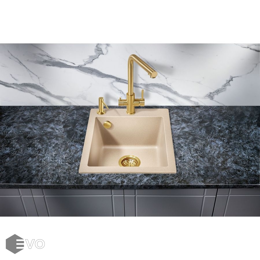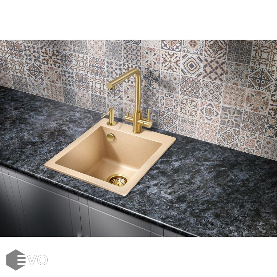 Каменная врезная прямоугольная мойка для кухни MILACIO Murcia 42 Cuarzo (MC.77044), выполненная в бежевом матовом цвете, воплотила в себе лучшие особенности: безупречный вид, лаконичный дизайн, прочность конструкции и комфортное использование. Раковина изготовлена из высококлассного кварцевого композита — смеси частиц кварца и полиэфирных смол — красивого и современного материала, обладающего уникальной прочностью. Искусственный камень устойчив к любым воздействиям — царапинам, ударам, высоким и низким температурам (не боится кипятка и горячей посуды), бытовой химии, пищевым красителям, свету и загрязнению. Даже спустя годы изделие не потеряет цвет и форму и будет должным образом выполнять свои функции. Кухонная кварцевая мойка достаточно компактна, чтобы лучшим образом использовать пространство в небольшой комнате. Размер компенсируется глубокой чашей квадратной формы — в нее поместятся сразу несколько комплектов посуды. Благодаря правильной геометрии мойки капли не разбрызгиваются в стороны, а специальное водоотталкивающее покрытие не дает воде растекаться по поверхности, что сводит загрязнение к минимуму. При этом уход за раковиной достаточно прост: пятна легко убираются чистящими средствами — без подтеков и разводов.