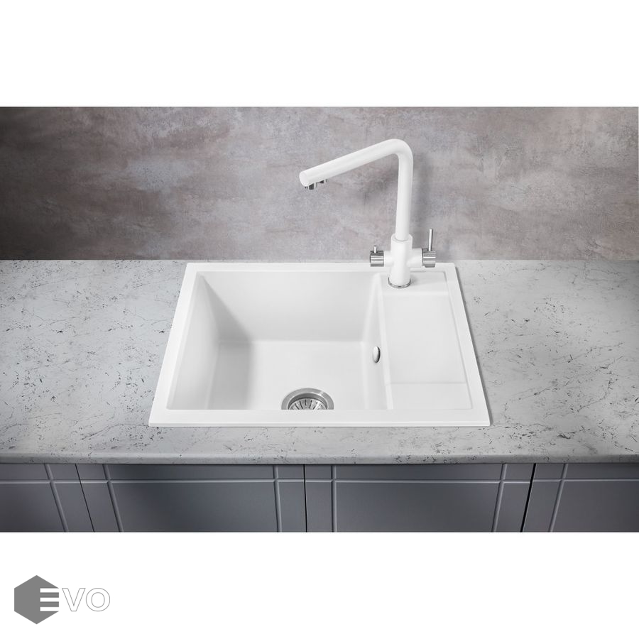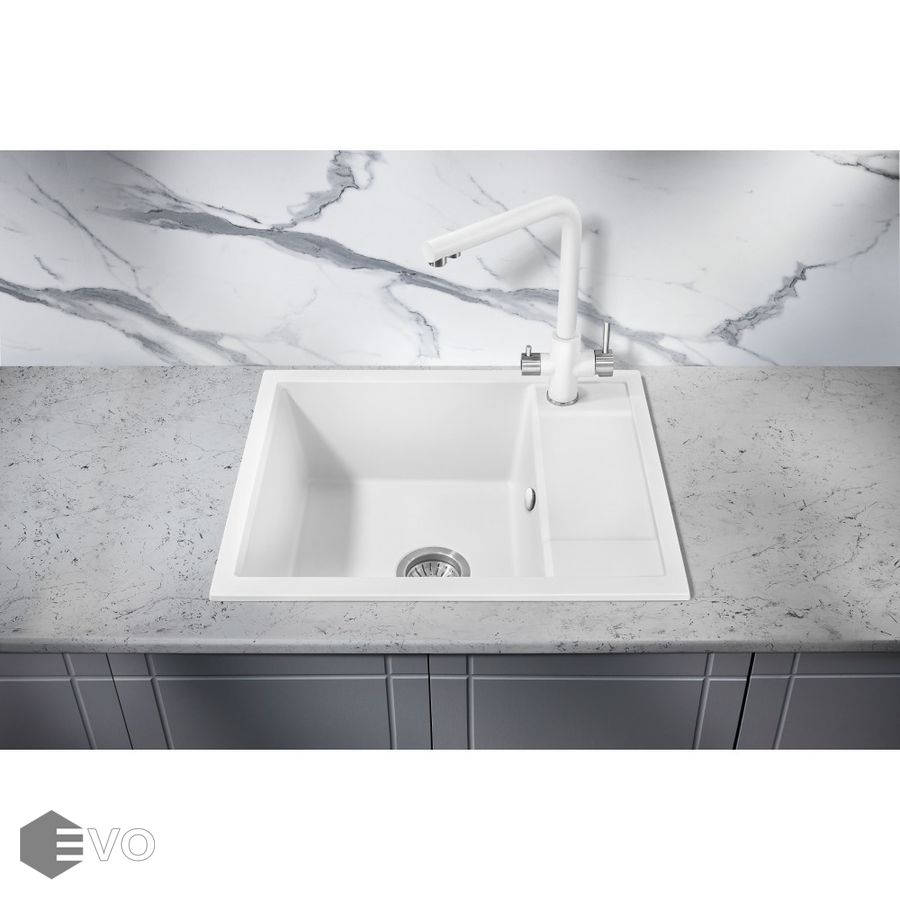 Врезная прямоугольная мойка для кухни из искусственного камня MILACIO Navarra 60 Cuarzo (MC.77072), выполненная в белом матовом цвете, станет яркой, привлекающей внимание деталью в вашем кухонном интерьере.