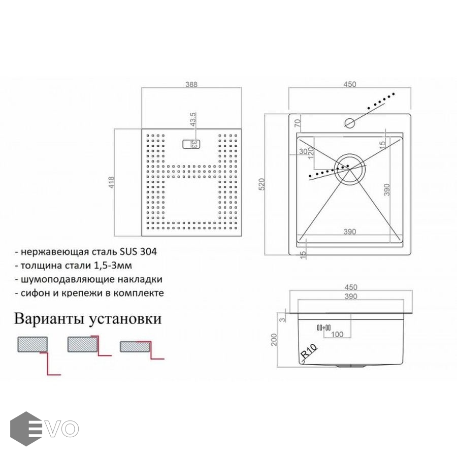 Радиус внутренних углов мойки составляет 10 мм, а глубина чаши 200 мм.