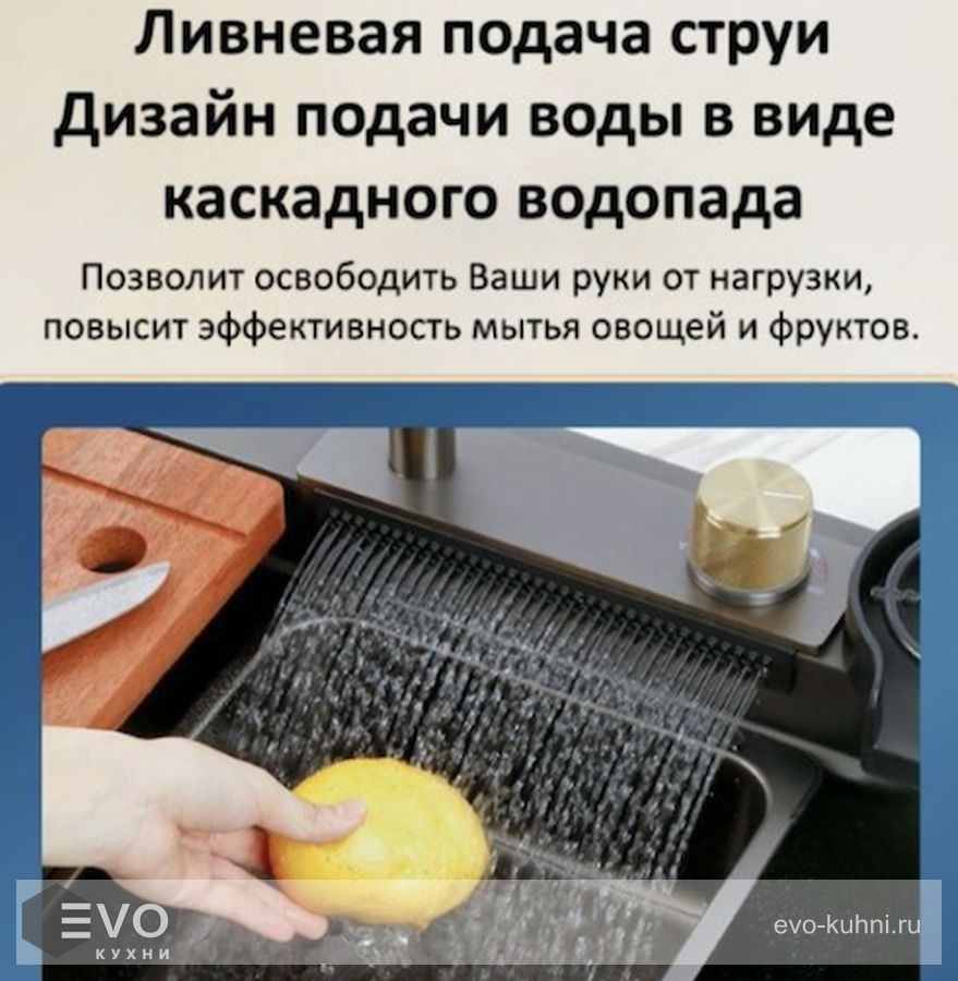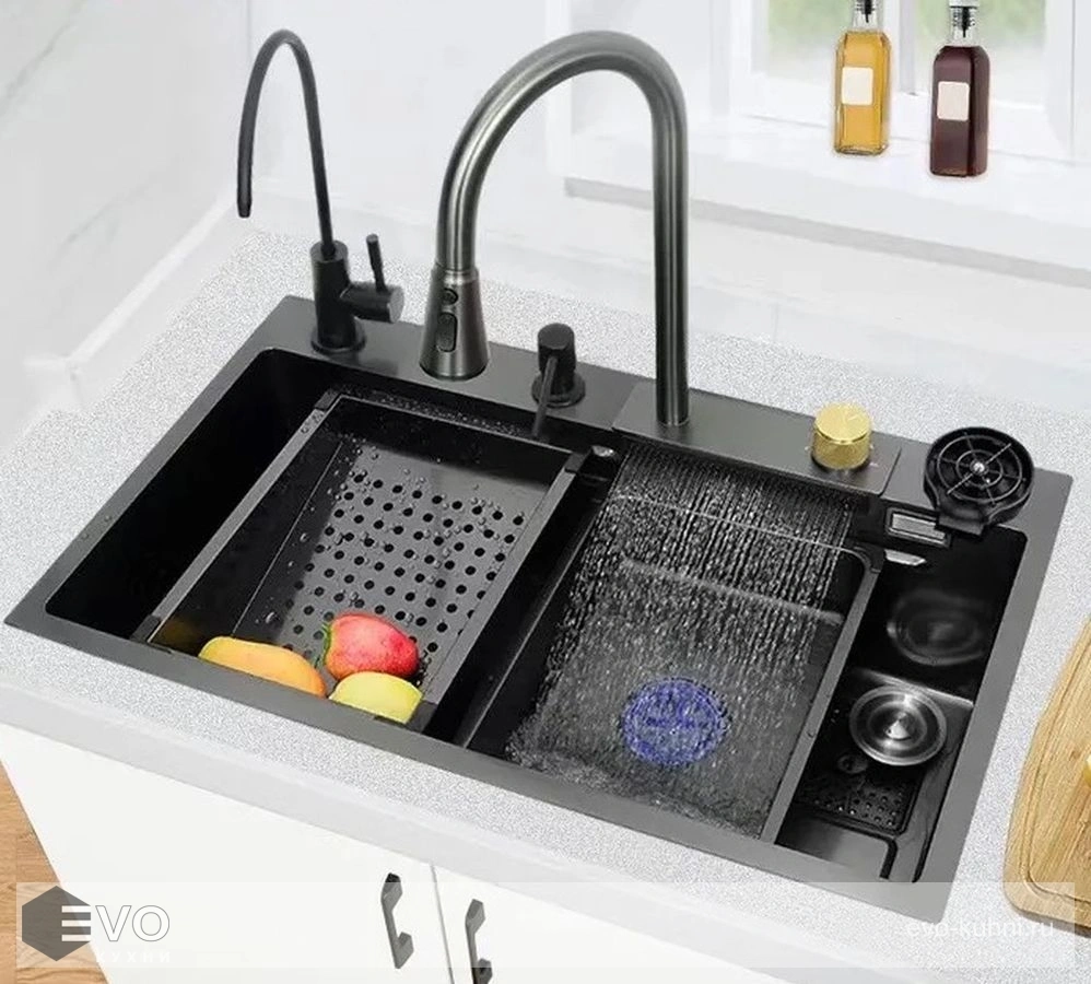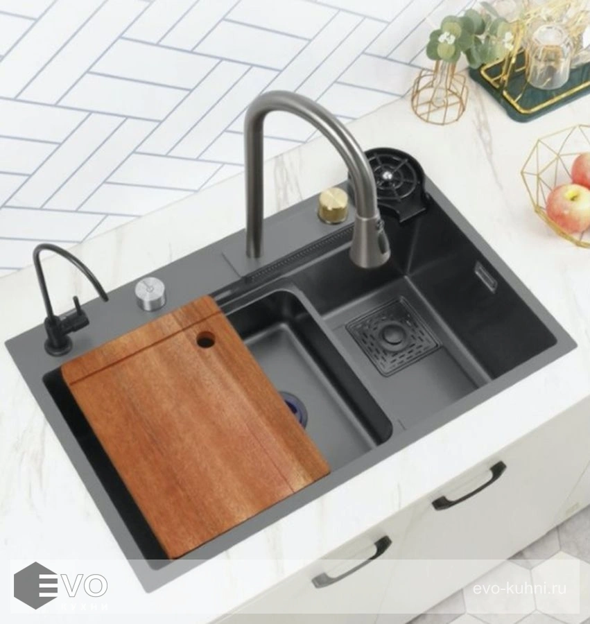 Дозатор моющего средства, питьевой кран и ополаскиватель стаканов, размещенные на кухонной мойке дополняют и без того богатый функционал этой высокотехнологичной кухонной мойки!