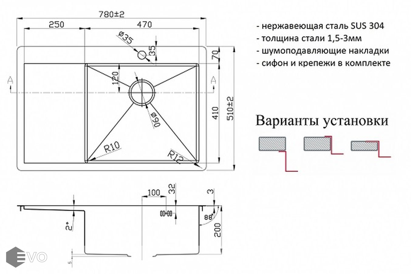 - Тип монтажа: Врезная сверху / Под столешницу / В уровень со столешницей