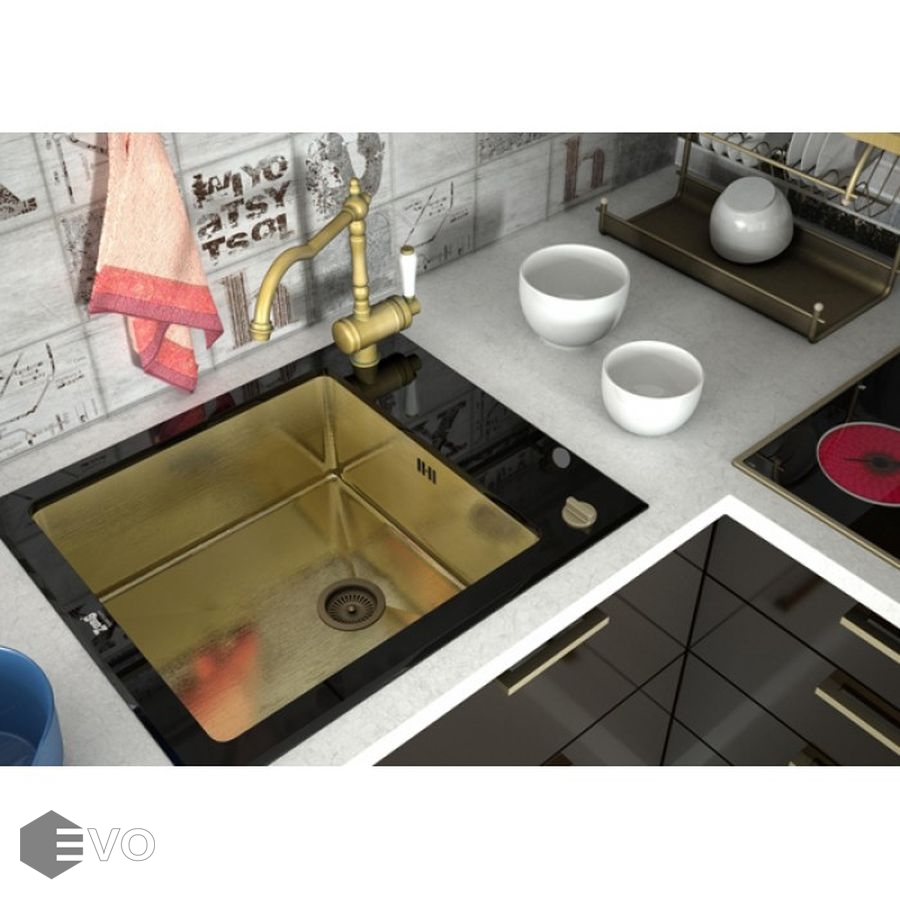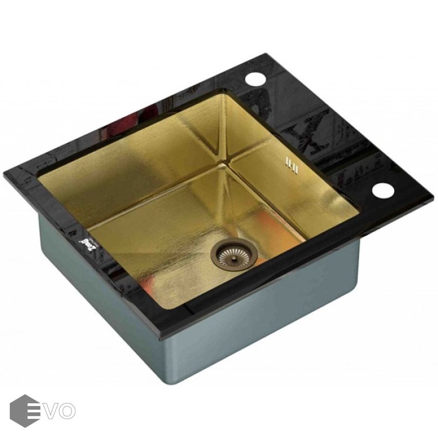 Покрытие наносится в специальной вакуумной камере и проникает в поверхность изделия на молекулярном уровне. Молекулы наносимого металла соединяются с нержавеющей сталью и получается красивая благородного бронзового цвета кухонная мойка. Такая поверхность прочна и долговечна, не стирается по прошествии времени. Чаша мойки производится из высококачественной легированной нержавеющей стали с содержанием хрома 18%, никеля 10% и обладает всем достоинствами этого материала, а крыло и рама выполнены из безопасного закаленного стекла черного цвета, толщиной 8 мм.