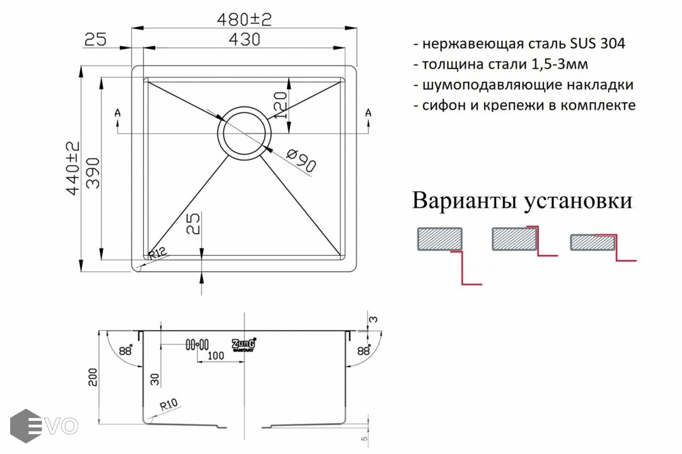 - толщина мойки 1,5 мм (бортик мойки 3 мм)