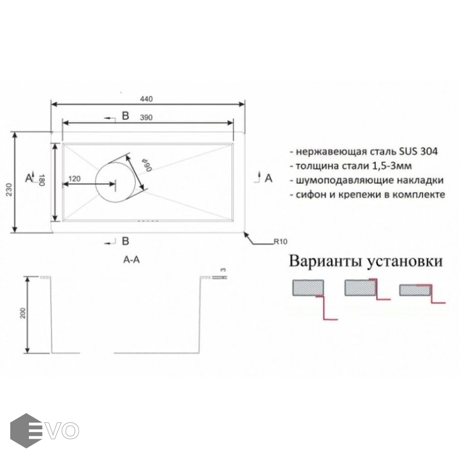 Мойка Zorg R-2344 из нержавеющей стали марки 304 отличается толщиной верхней поверхности (3 мм) и толщиной стенок (1.5 мм). Кроме этого, тыльная поверхность мойки покрыта полимером для уменьшения возникновения звука от воды.