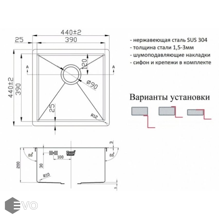 Мойка Zorg R-4444 из нержавеющей стали марки 304 отличается особо большой толщиной верхней поверхности (3 мм) и толщиной стенок (1.5 мм). Кроме этого, тыльная поверхность мойки покрыта полимером для уменьшения возникновения звука от воды.