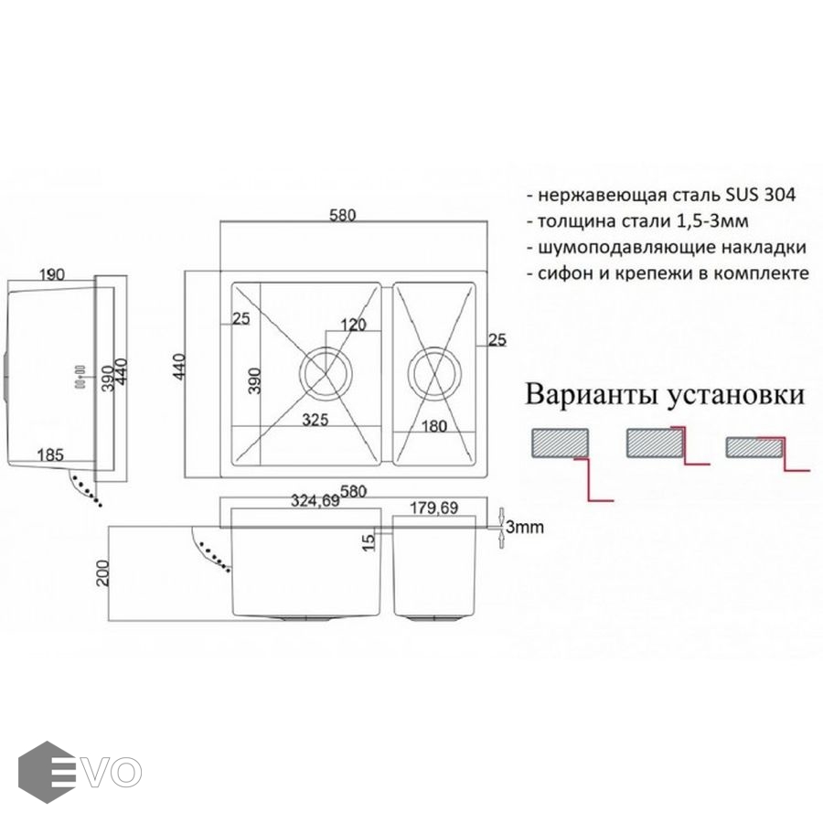 Огромным преимуществом мойки Zorg R 58-2-44 является её универсальность установки. Вы можете установить данную модель сверху столешницы, вровень или снизу (подстольный монтаж).