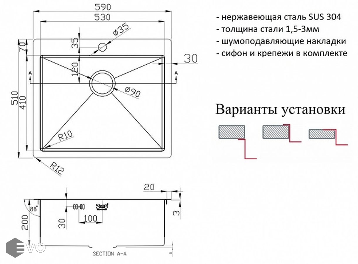 Характерными особенностями серии моек Zorg R является плоский кант (3 мм) и радиусы скруглений чаши (R10 мм), а также возможность устанавливать мойку тремя способами установки (врезной монтаж, в один уровень и подстольный монтаж).