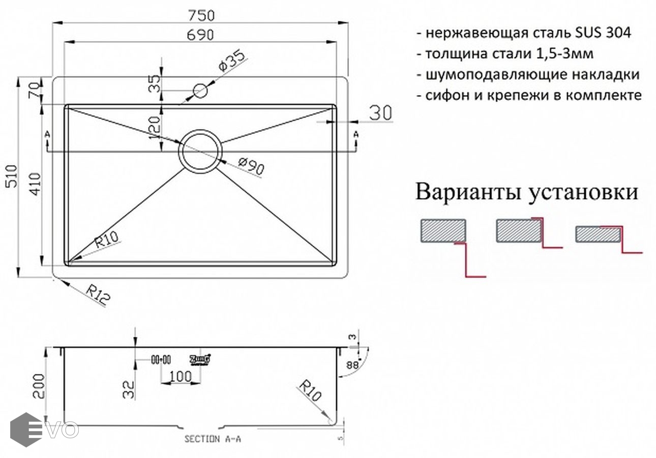 Характерными особенностями серии моек Zorg R является плоский кант (3 мм) и радиусы скруглений чаши (R10 мм), а также возможность устанавливать мойку тремя способами установки (врезной монтаж, в один уровень и подстольный монтаж).