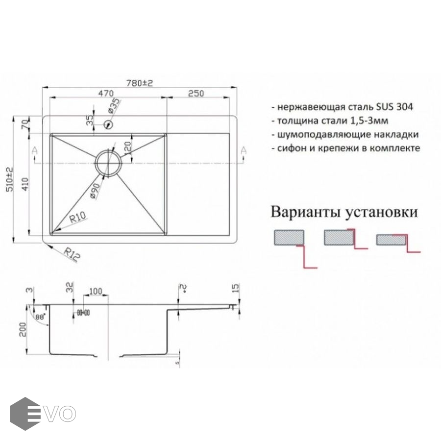 Мойка Zorg R 7851-L из нержавеющей стали марки 304 отличается толщиной верхней поверхности (3 мм) и толщиной стенок (1.5 мм). Кроме этого, тыльная поверхность мойки покрыта полимером для уменьшения возникновения звука от воды.