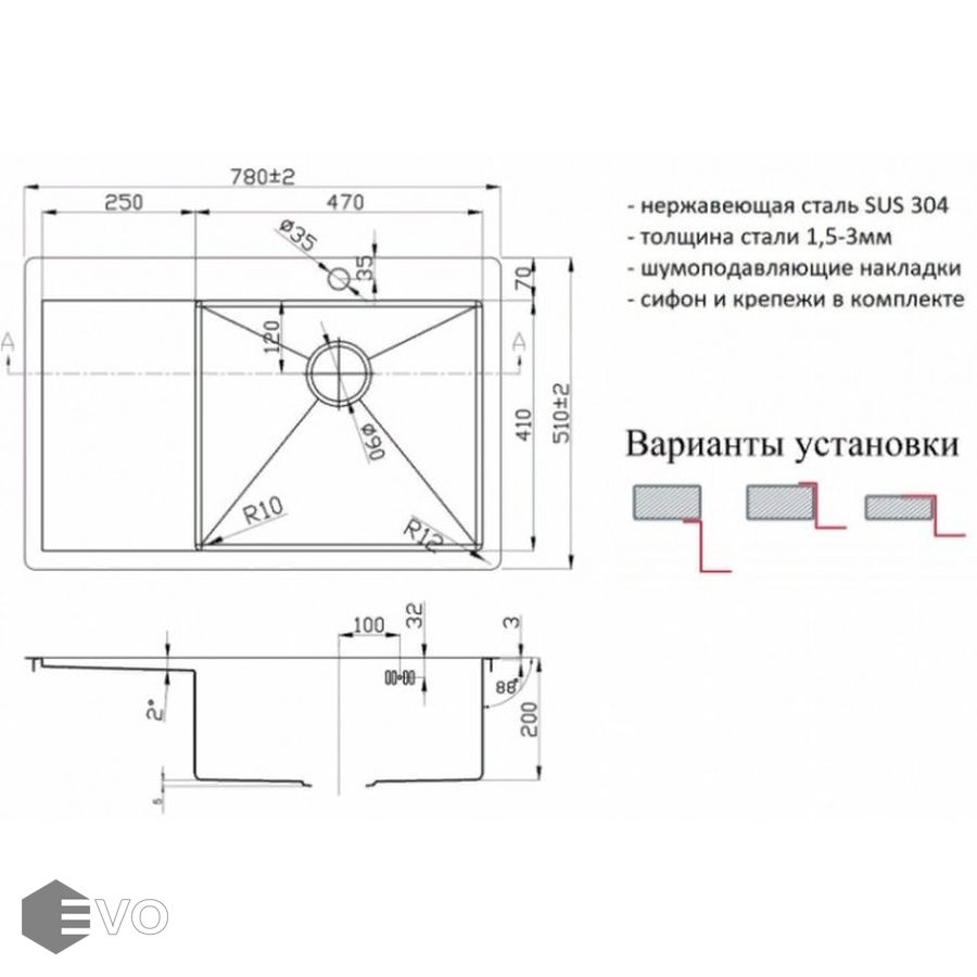 Мойка Zorg R 7851-R из нержавеющей стали марки 304 отличается толщиной верхней поверхности (3 мм) и толщиной стенок (1.5 мм). Кроме этого, тыльная поверхность мойки покрыта полимером для уменьшения возникновения звука от воды.