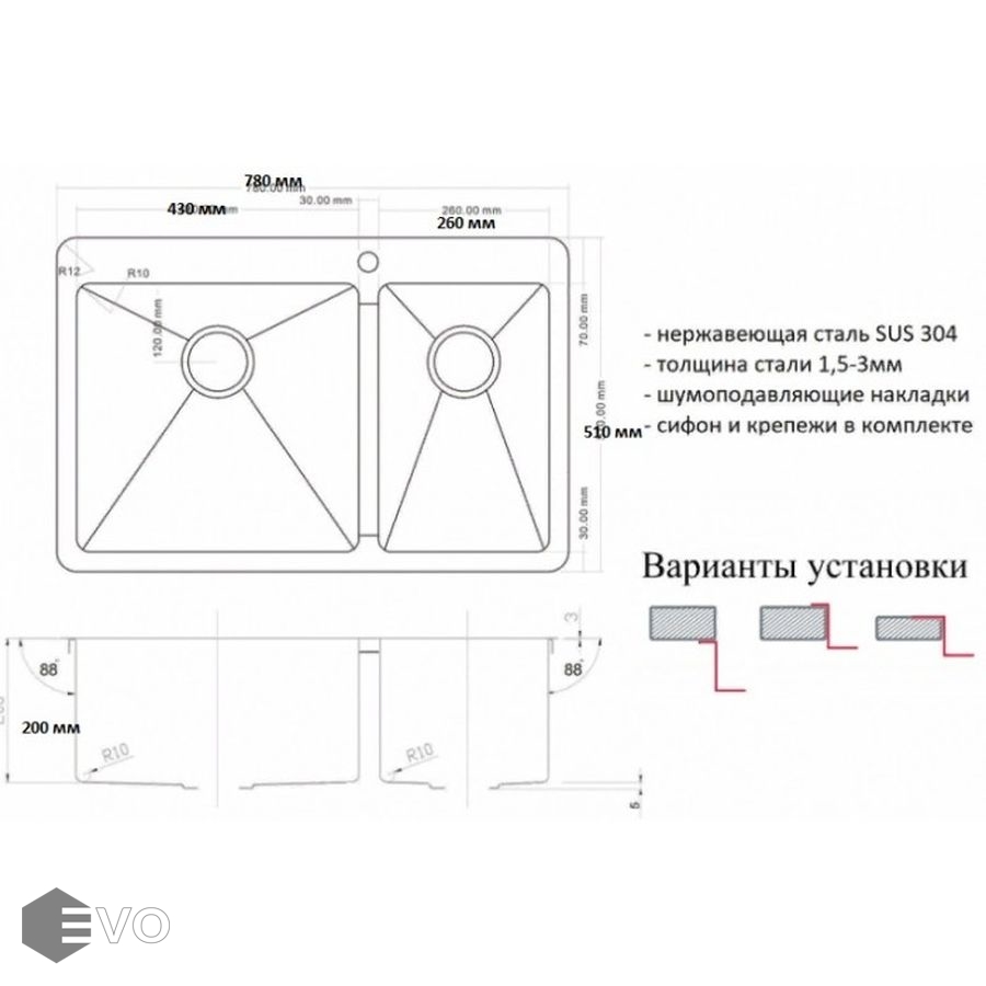Мойка Zorg R-78-2-51-L из нержавеющей стали марки 304 отличается толщиной верхней поверхности (3 мм) и толщиной стенок (1.5 мм). Кроме этого, тыльная поверхность мойки покрыта полимером для уменьшения возникновения звука от воды.