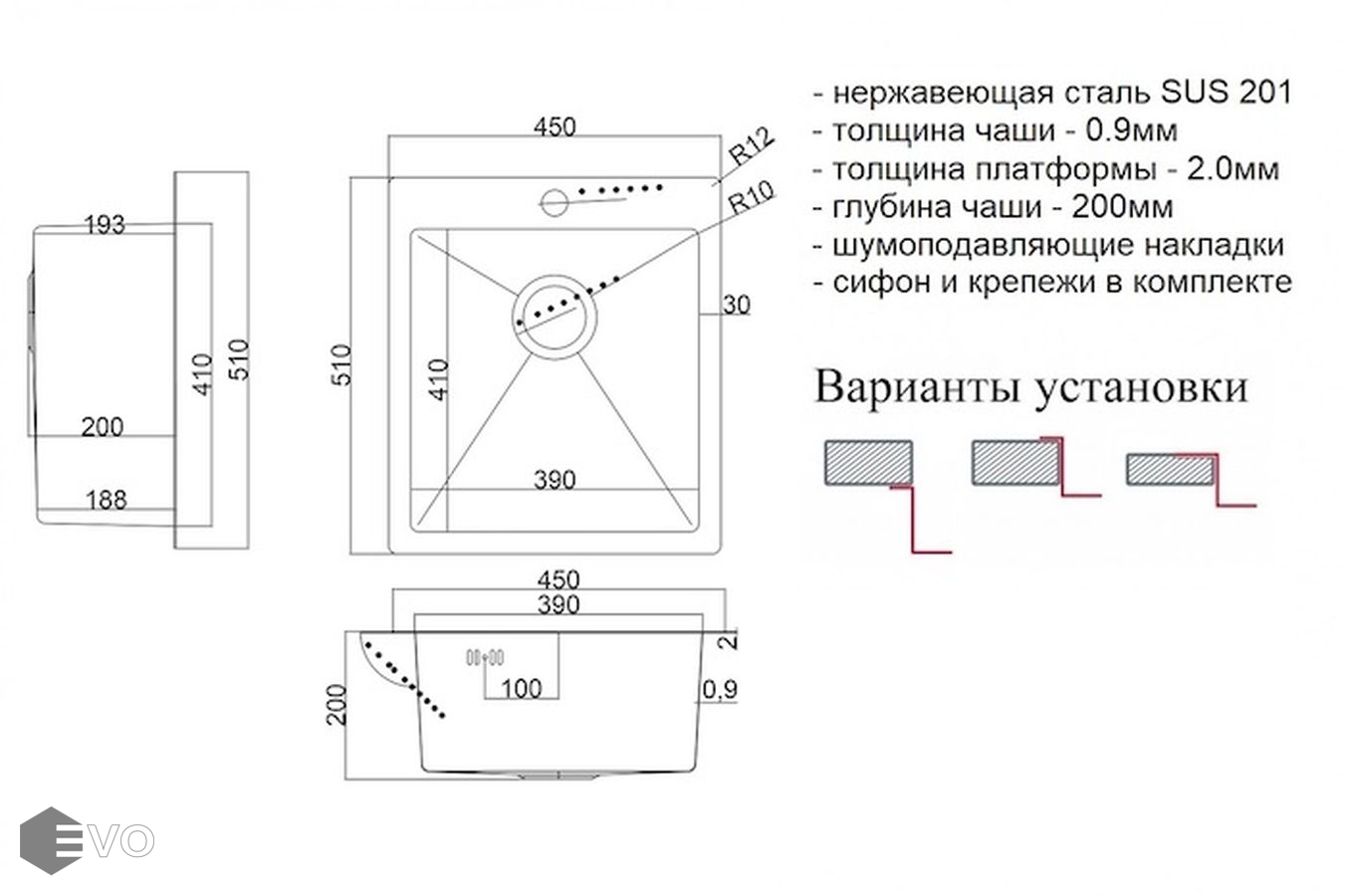 - глубокая вместительная моечная чаша 200 мм с радиусами скруглений R10 мм