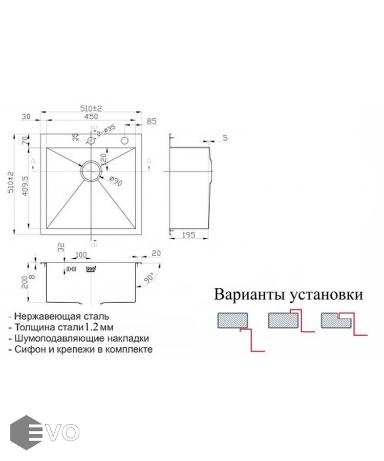 - СПОСОБ УСТАНОВКИ: Сверху на столешницу, Под столешницу, Вровень со столешницей