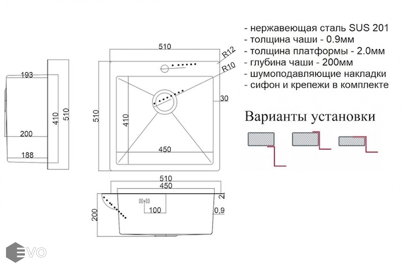 - глубокая вместительная моечная чаша 200 мм с радиусами скруглений R10 мм