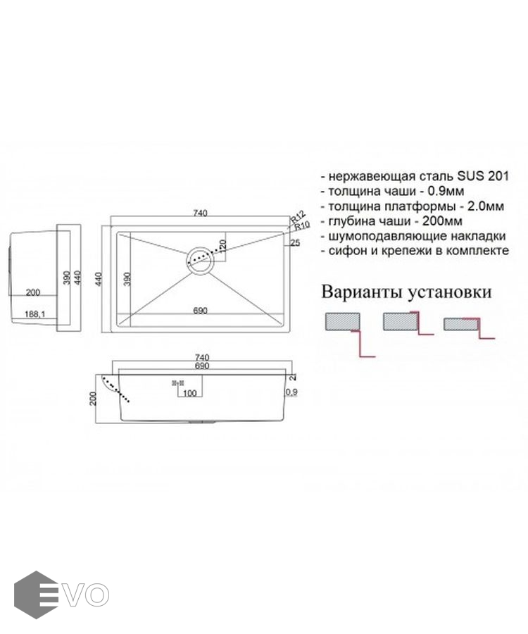 Чаша мойки выполнена из нержавеющей стали толщиной 0.9 мм, а кант (бортик) имеет толщину 2 мм, что позволяет мойке идеально ложиться на поверхность столешницы. Скругленные внешние и внутренние углы также придают мойке более эстетичный внешний вид и облегчают уход за поверхностью в районе углов мойки.