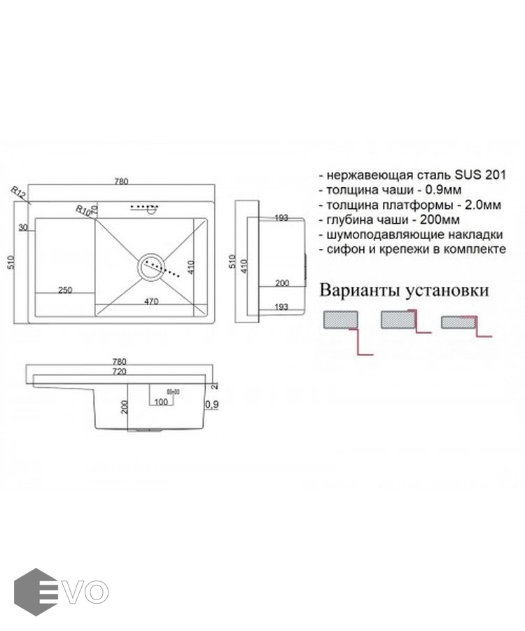 - мойка выполнена из нержавеющей стали марки SUS 201