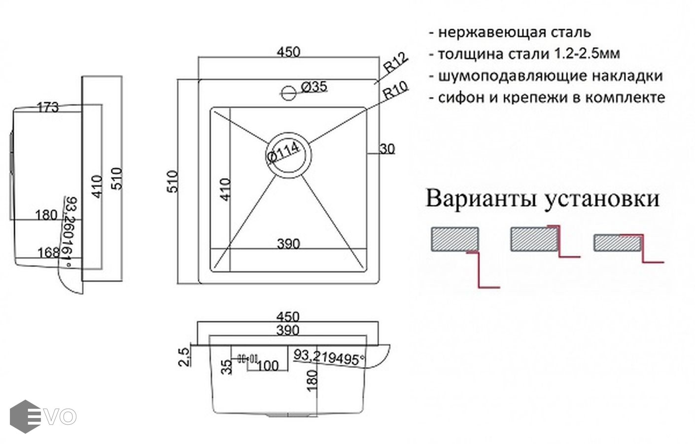 - глубокая вместительная моечная чаша 180 мм с радиусами скруглений R10 мм