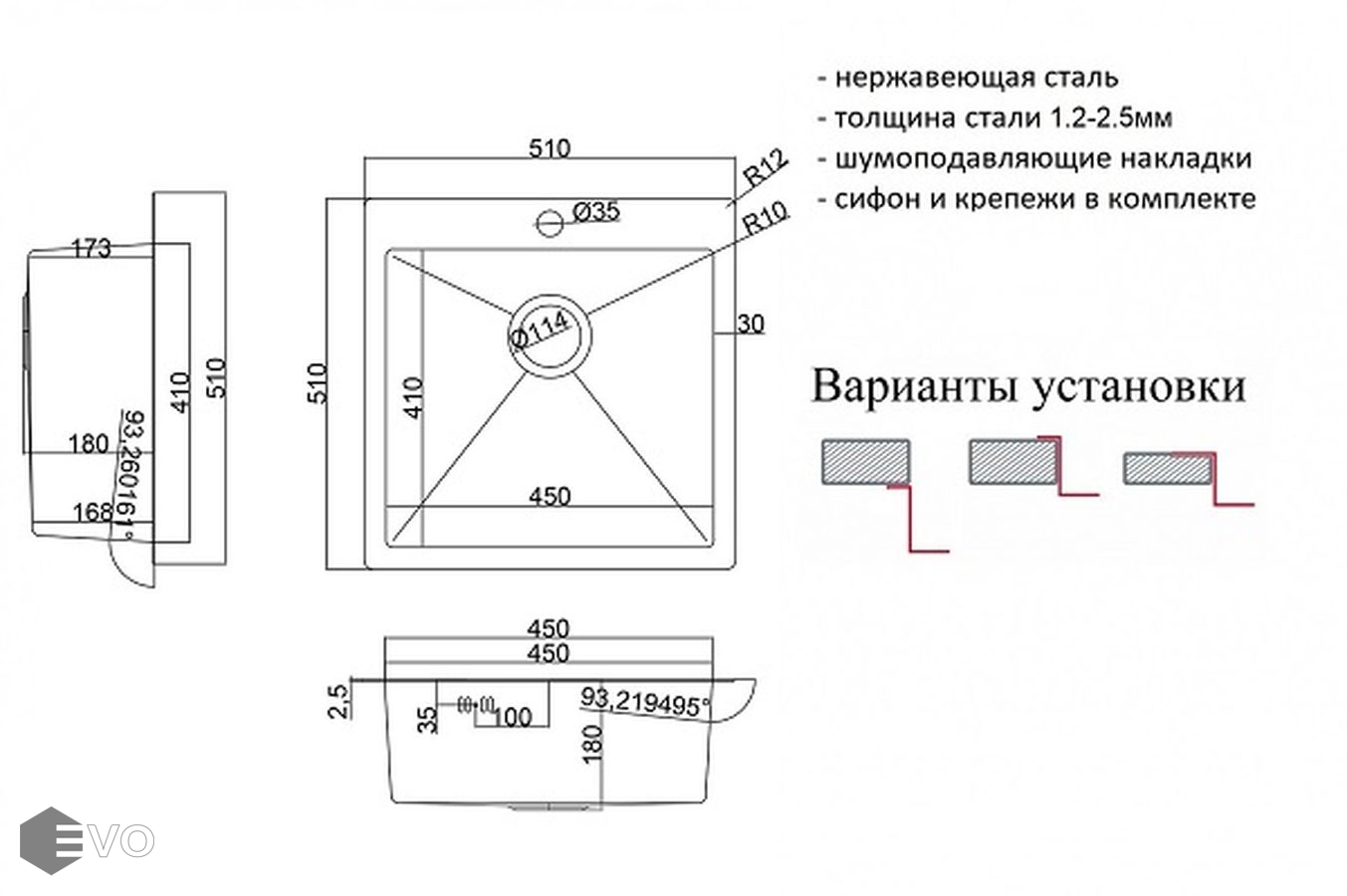 - глубокая вместительная моечная чаша 180 мм с радиусами скруглений R10 мм