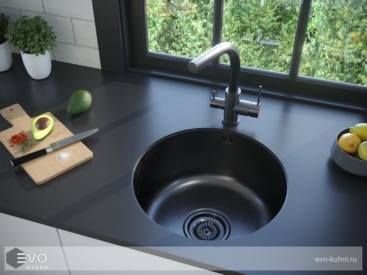 Стальная мойка с последующей специальной PVD-обработкой в цвет графит. Покрытие наносится в специальной вакуумной камере и проникает в поверхность изделия на молекулярном уровне. Молекулы наносимого металла соединяются с нержавеющей сталью и получается красивая кухонная мойка благородного цвета. Такая поверхность прочна и долговечна, не стирается по прошествии времени.