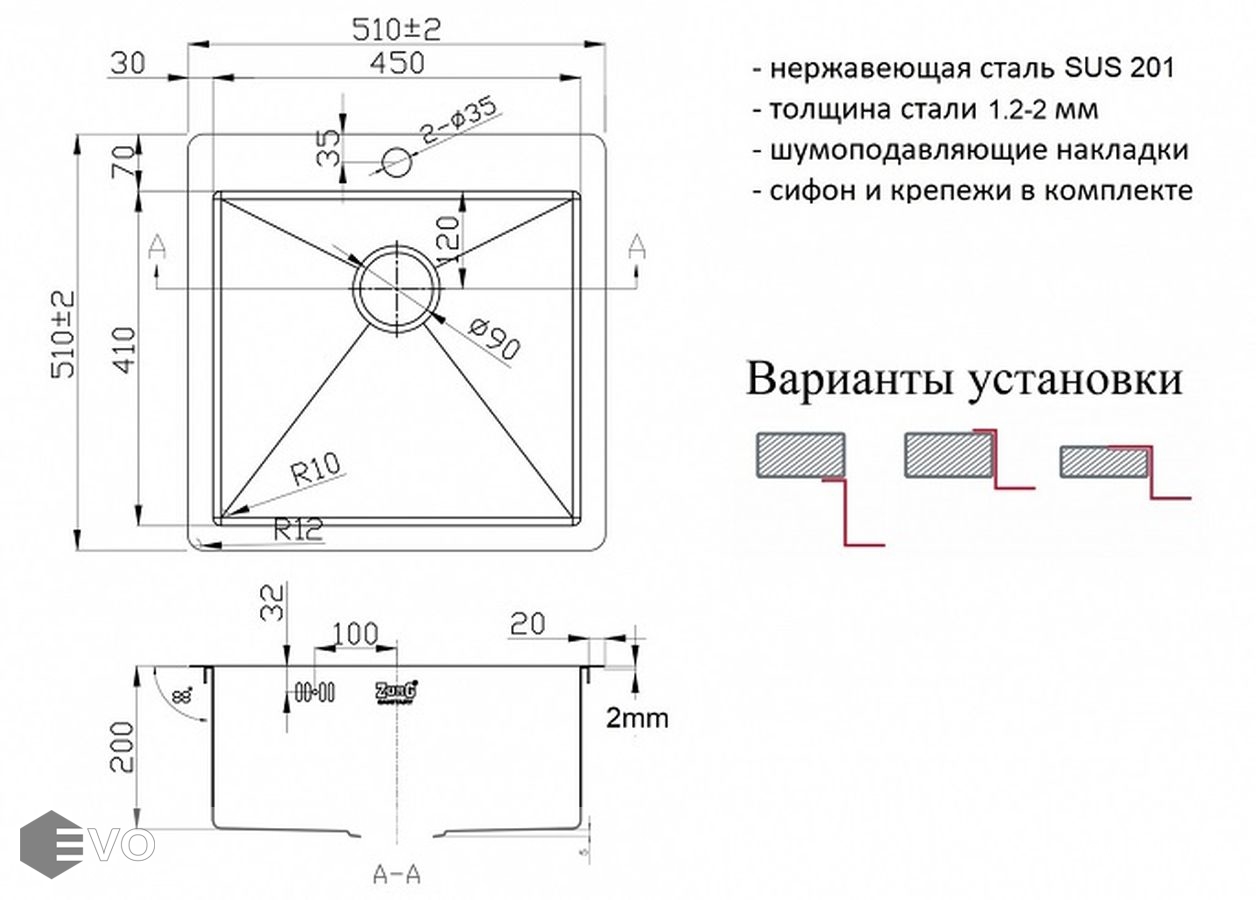 Комплект поставки ZORG ZL R 510510: Мойка, сливная арматура с корзинчатым вентилем 3 1/2, сифон с отводом, комплект креплений, шаблон. ВАЖНО! Возможны три варианта установки мойки: сверху на столешницу, снизу под столешницу, вровень со столешницей.