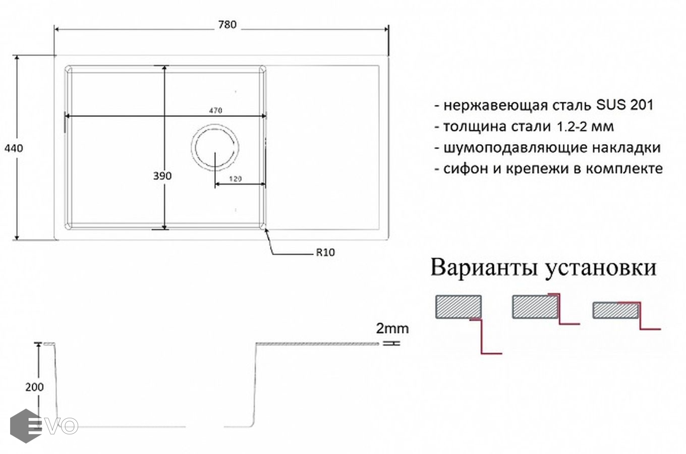 Характерными особенностями серии моек Zorg R является плоский кант (2 мм) и радиусы скруглений чаши (R10 мм), а также возможность устанавливать мойку тремя способами установки (врезной монтаж, в один уровень и подстольный монтаж).