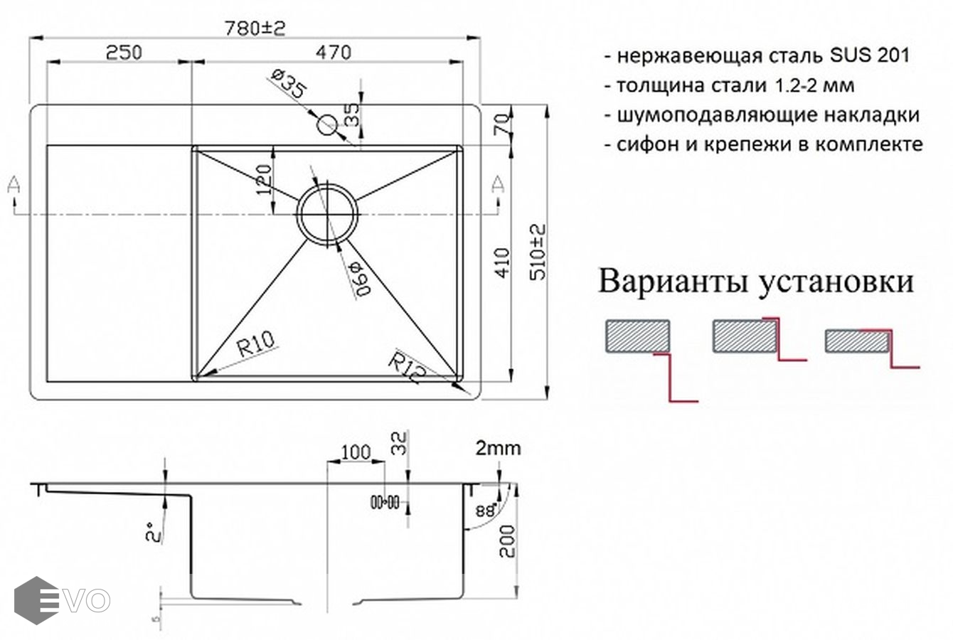 - толщина мойки 1,2 мм (бортик мойки 2 мм)