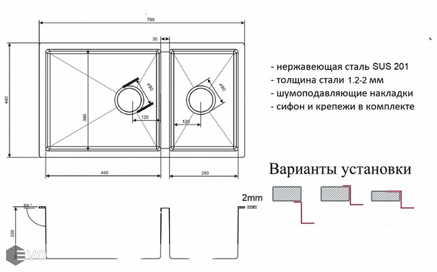 ВАЖНО! Возможны три варианта установки мойки: сверху на столешницу, снизу под столешницу, вровень со столешницей.