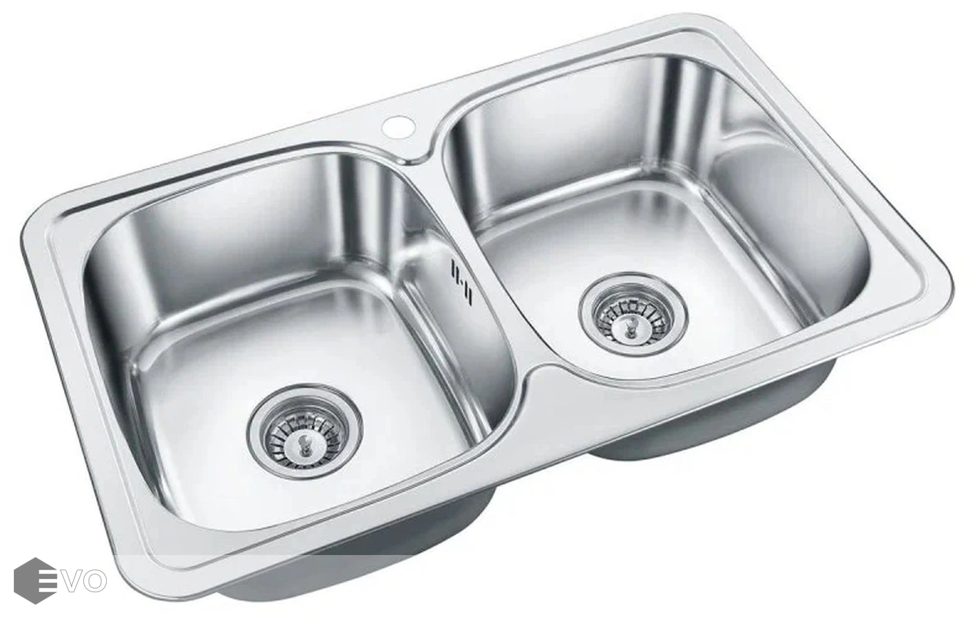 Двухчашевая мойка из нержавеющей стали с полированной поверхностью.