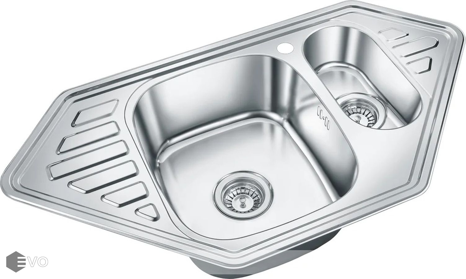 Мойка с двумя чашами и удобным крылом. Крыло у мойки расположено с правой стороны. С левой стороны от чаши, сделана специальная площадка для хранения посуды или кухонного инвентаря.