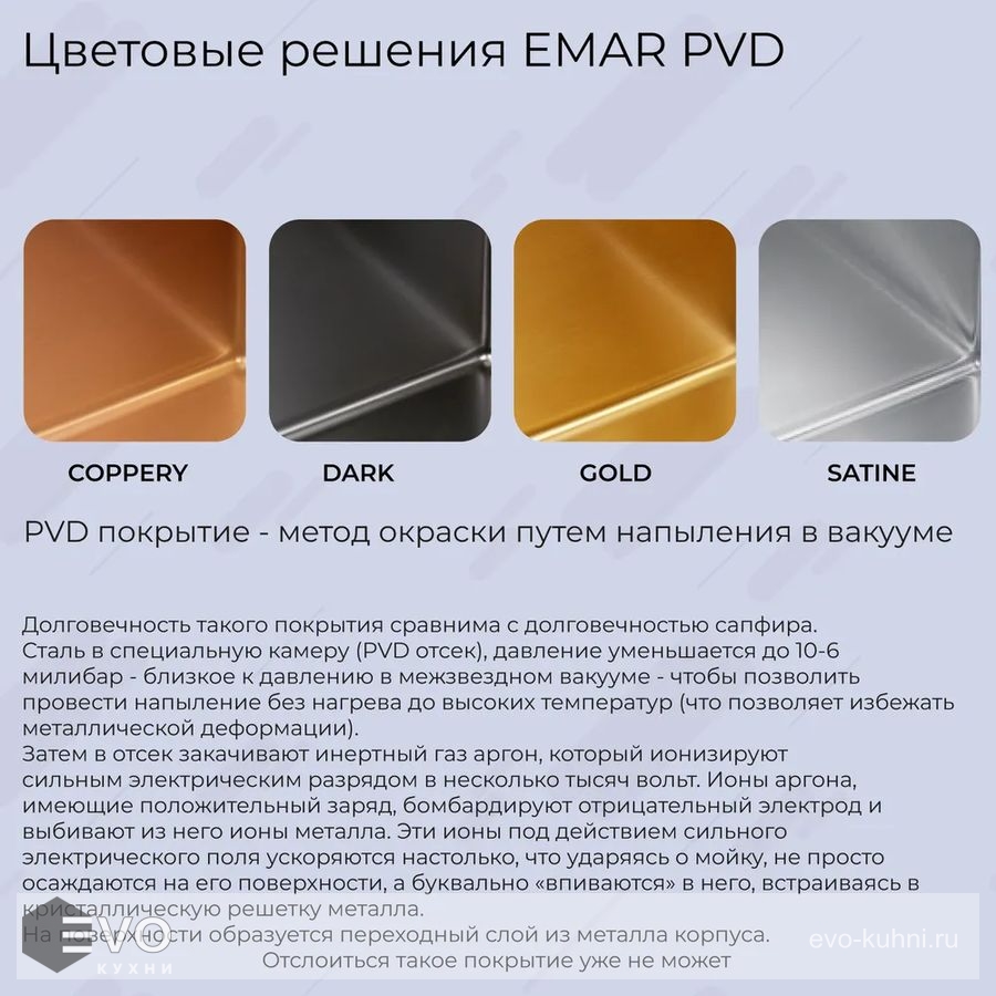 PVD-покрытие – это покрытие выполненное методом напыления в вакууме, при котором частицы покрытия соединяются с молекулярной структурой металла и образуют прочный защитный слой.