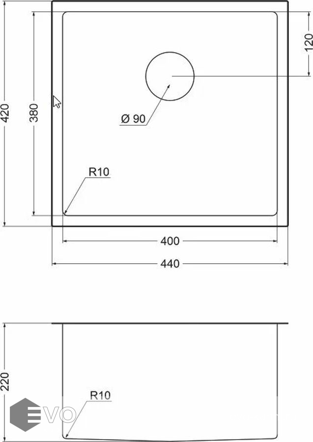- Размеры мойки: 440x420 мм и R10 радиус закругления. Внутренние стороны также, с R10 радиусом закругления