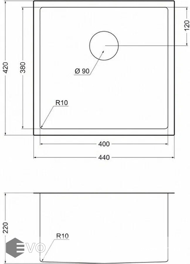 - Размеры мойки: 440x420 мм и R10 радиус закругления. Внутренние стороны также, с R10 радиусом закругления