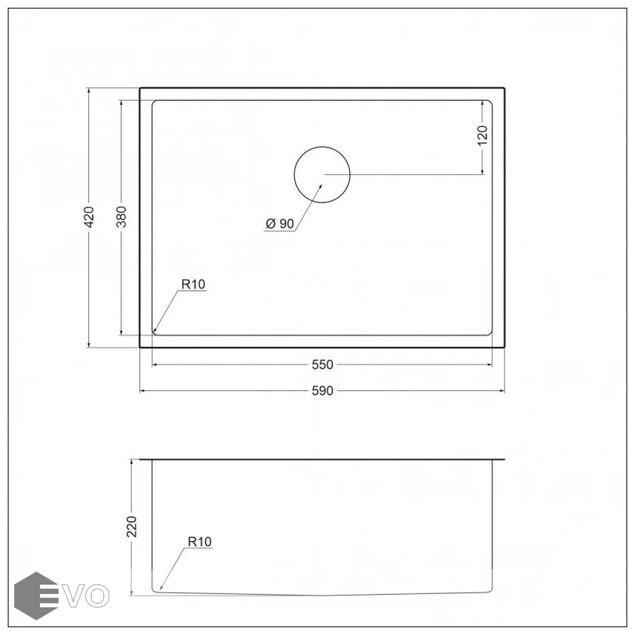 • Размеры мойки: 590x420 мм и R5 радиус закругления. Внутренние стороны также, с R5 радиусом закругления