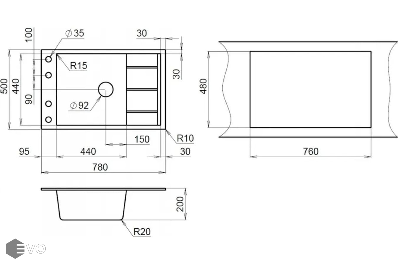 Кварцевая мойка EMAR EMQ-1780.Q Антрацит является одной из самых больших в линейке кварцевых моек. Данная модель отличается универсальным дизайном. На крыле гладкая поверхность, без пор. На него удобно ставить тарелки, чистящие средства, губки и другие кухонные аксессуары. Мойка сделана из кварцевой крошки на всю глубину материала.