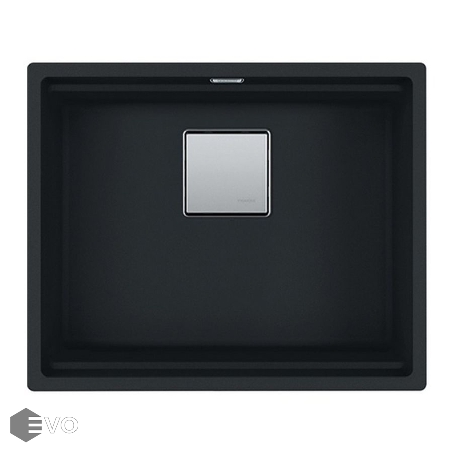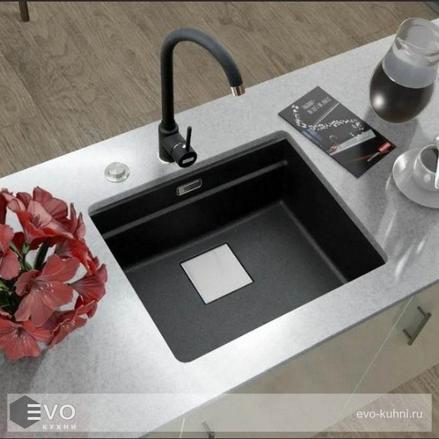 Мойка из запатентованного материала FRAGRANITE®, врезная под столешницу, прямоугольная с переливом и декоративной накладкой на выпуск из нержавеющей стали, вентиль-автомат с кнопкой EASY CLICK из нержавеющей стали.
