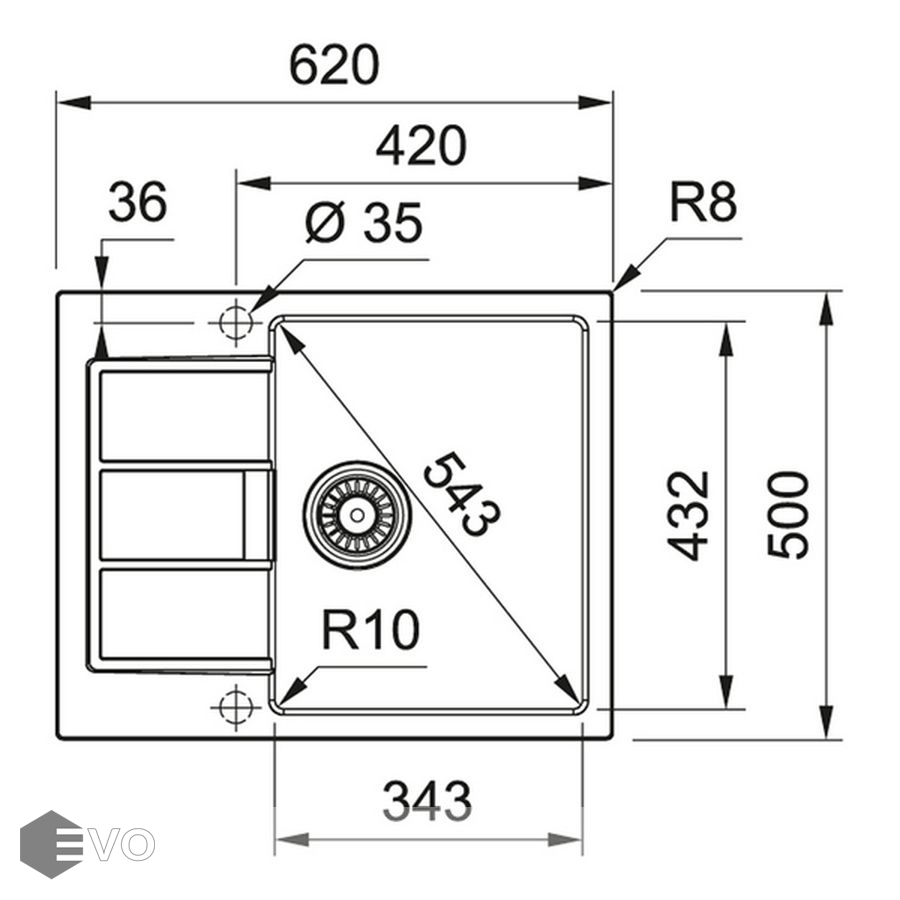 Мойка из материала Tectonite (композитный полимер), врезная, прямоугольная с декоративным переливом, оборачиваемая.
